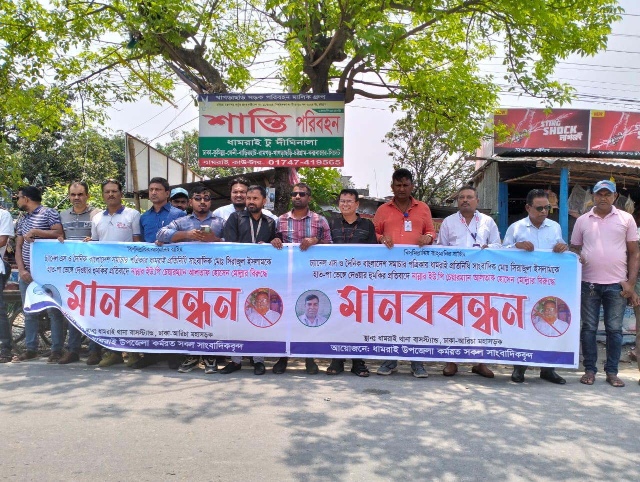 শনিবার (১১ মে) সকাল ১১ টায় ধামরাই উপজেলা প্রেসক্লাবের সামনে ঘন্টা ব্যাপী এই মানববন্ধন ও প্রতিবাদ সমাবেশ অনুষ্ঠিত হয়।