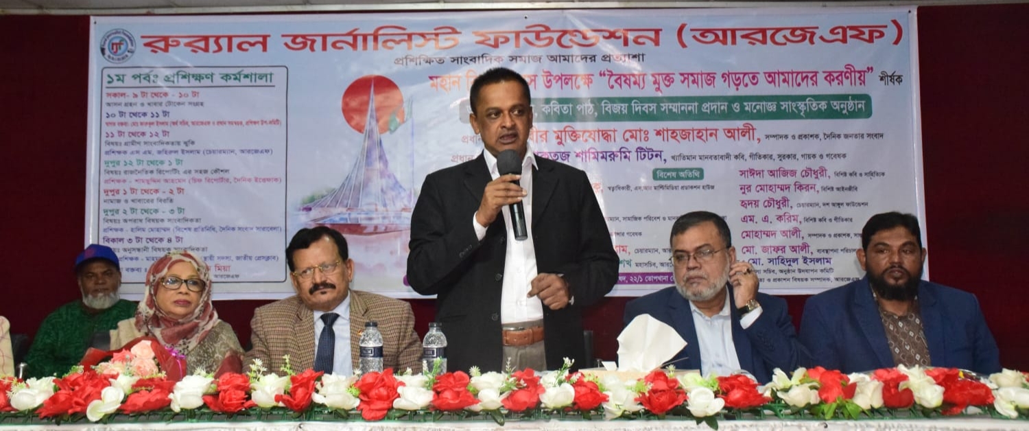 রুর্যাল জার্নালিস্ট ফাউন্ডেশন (আরজেএফ) এর উদ্যোগে মহান বিজয় দিবস উপলক্ষে বৈষম্য মুক্ত শীর্ষক আলোচনা সভা ও মফস্বল সাংবাদিকদের সাংবাদিক প্রশিক্ষণ কর্মশালা ৩০ ডিসেম্বর দিনব্যাপী ঢাকার বাংলাদেশ শিশু কল্যাণ পরিষদ মিলনায়তনে অনুষ্ঠিত হয়। আরজেএফ চেয়ারম্যান এস এম জহিরুল ইসলামের সভাপতিত্বে ও মহাসচিব মোঃ সেকেন্দার আলম শেখের সঞ্চালনায় অনুষ্ঠানে প্রধান অতিথি হিসেবে উপস্থিত ছিলেন দৈনিক জনতার সংবাদের সম্পাদক বীর মুক্তিযোদ্ধা মোঃ শাহজাহান আলী।