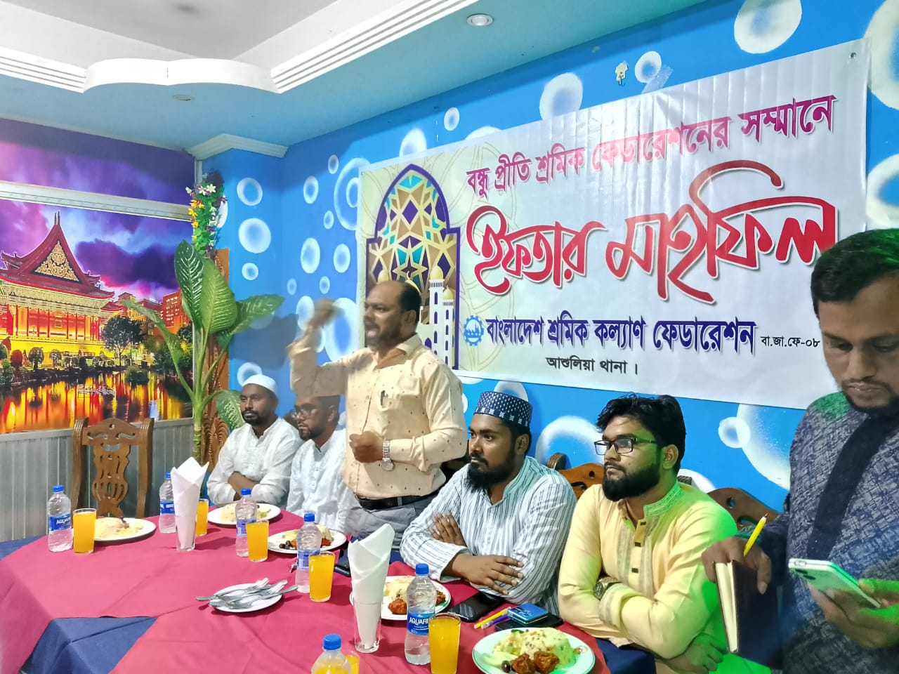 ঢাকার শিল্পাঞ্চল আশুলিয়ায় বাংলাদেশ শ্রমিক কল্যান ফেডারেশন আশুলিয়া থানা শাখা কর্তৃক আশুলিয়ার বন্ধুপ্রতিম শ্রমিক সংগঠনের নেতা-কর্মীদের সম্মানে ইফতার মাহফিল অনুষ্ঠিত হয়।