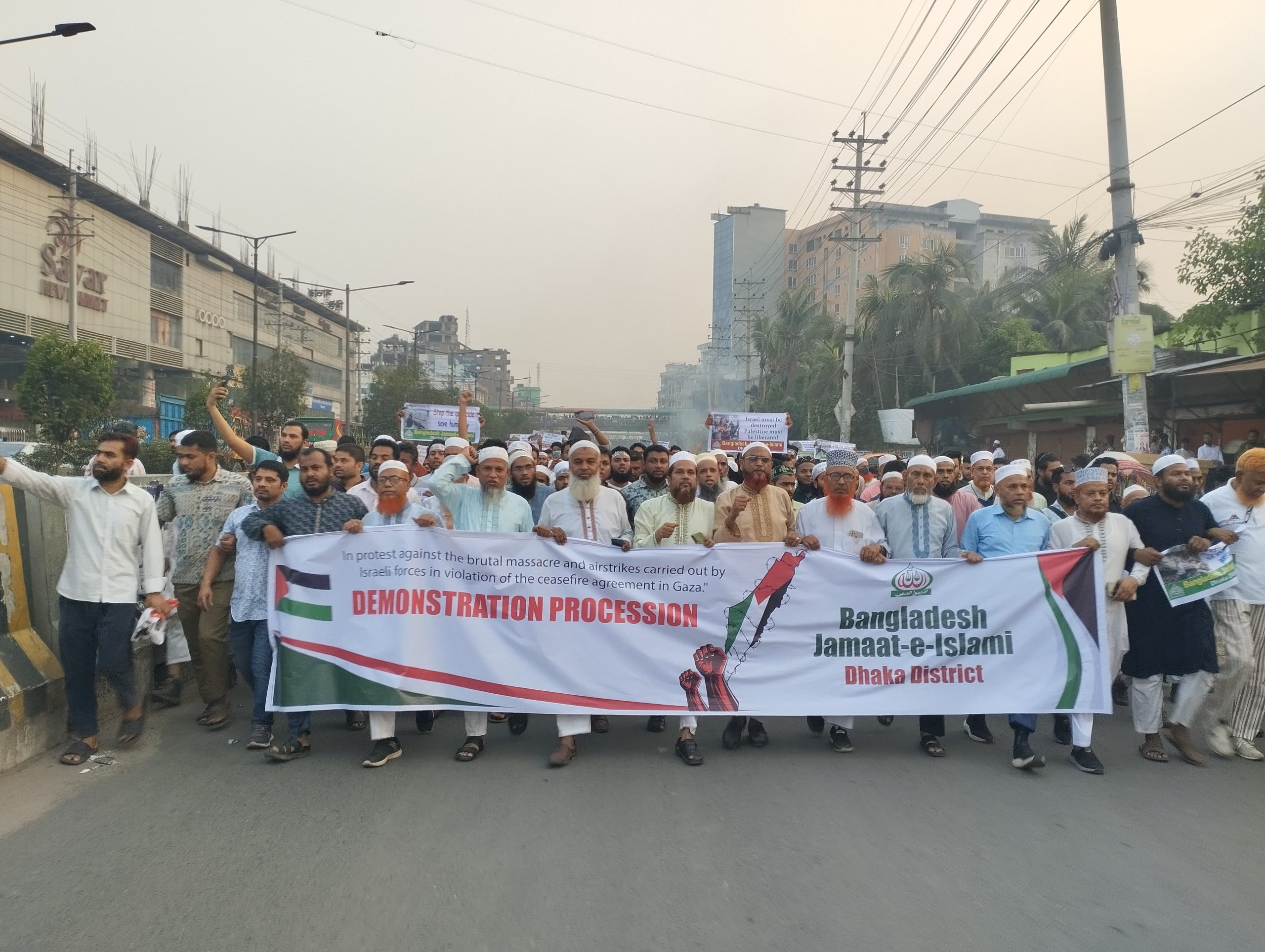 বিক্ষোভ মিছিলের পূর্বে সংক্ষিপ্ত সমাবেশে বাংলাদেশ জামায়াতে ইসলামী, ঢাকা জেলার আমীর মাওলানা মোহাম্মদ দেলোয়ার হোসাইন এর সভাপতিত্বে এবং জেলা সেক্রেটারি মাওলানা অধ্যক্ষ মোঃ আফজাল হোসাইনের সঞ্চালনায় বক্তব্য রাখেন জেলা নায়েবে আমীর মাওলানা আব্দুর রউফ, সহকারী সেক্রেটারি মাওলানা শাহাদাত হোসাইন, রাজনৈতিক সেক্রেটারি হাসান মাহবুব মাস্টার, আইন বিষয়ক সেক্রেটারি এডভোকেট মোঃ শহিদুল ইসলাম। বিক্ষোভ মিছিলে উপস্থিত ছিলেন জেলা কর্মপরিষদ সদস্য লুৎফর রহমান মোল্লা, জেলা প্রচার ও মিডিয়া সেক্রেটারি আসাদুজ্জামান জীম, সাভার পৌর আমীর আজিজুর রহমান ও সাভার থানা আমীর মুহাম্মদ আব্দুল কাদেরসহ বিভিন্ন স্তরের হাজার হাজার নেতাকর্মী ও ধর্মপ্রাণ মুসল্লীগণ।