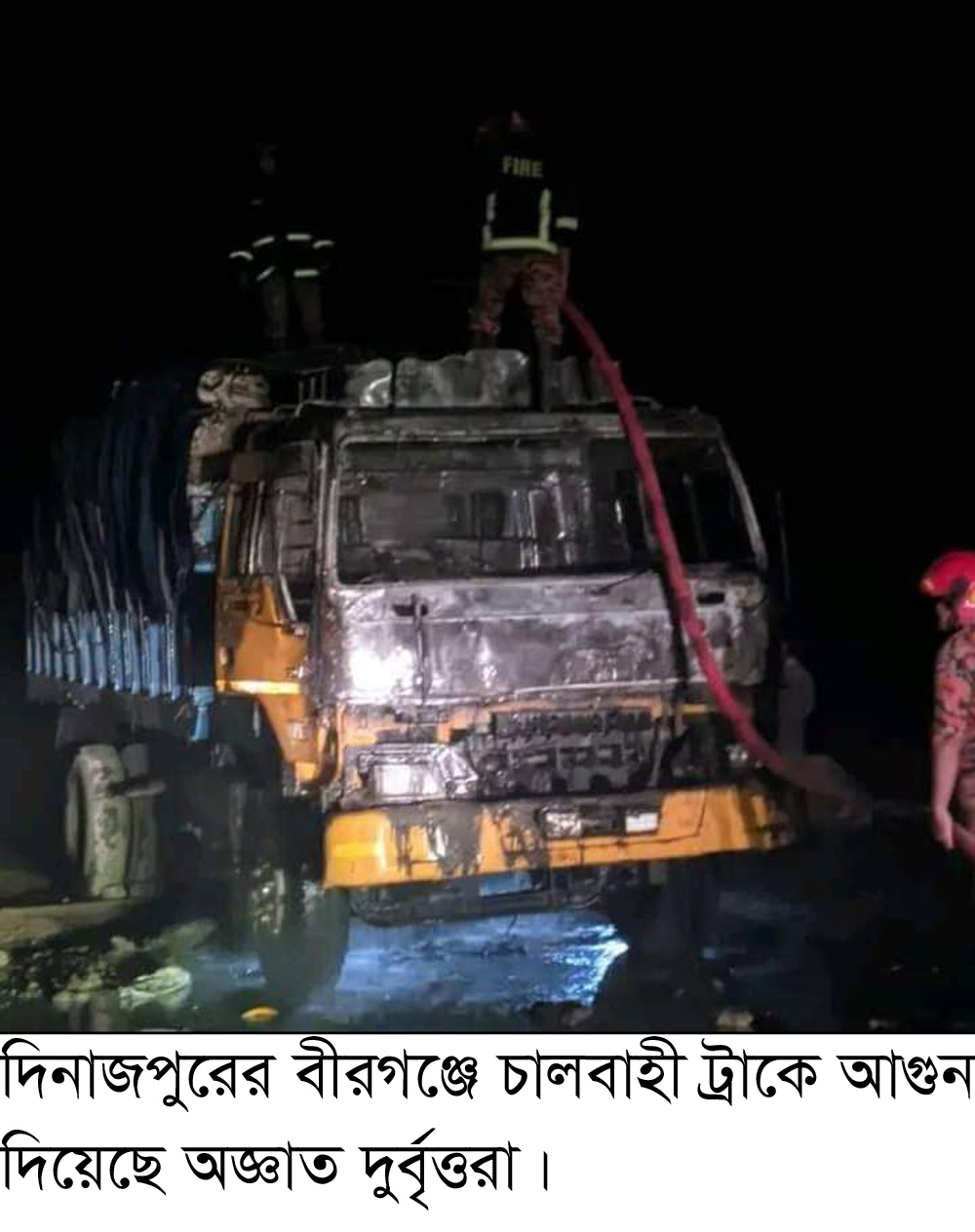 বীরগঞ্জ ফায়ার ষ্টেশনের সাব অফিসার মোঃ মসলেম উদ্দিন জানান, রাত আনুমানিক ১০টা ৫০মিনিটে চাল ভর্তি একটি আইসার ট্রাকে (ঢাকা-মেট্রো-ট-১৮-২৫৮৬) অজ্ঞাত দুর্বৃত্তরা অগ্নিসংযোগ করেছে মুটো ফোনে এমন সংবাদ পেয়ে ফায়ার ষ্টেশনের একটি ইউনিট ঘটনাস্থলে ছুটে যায়। ঘটনাস্থলে গিয়ে ট্রাকের আগুন নিভানো এবং উদ্ধার তৎপরতা শুরু করে ফায়ার ষ্টেশনের সদস্যরা। অগ্নিকান্ডে হতাহতের কোন ঘটনা না ঘটলেও ট্রাকের সামনের অংশসহ বেশ কিছু চাল পুড়ে যায়। এতে আনুমানিক ২লক্ষ টাকার ক্ষয়ক্ষতি হয়েছে বলে তিনি জানান।